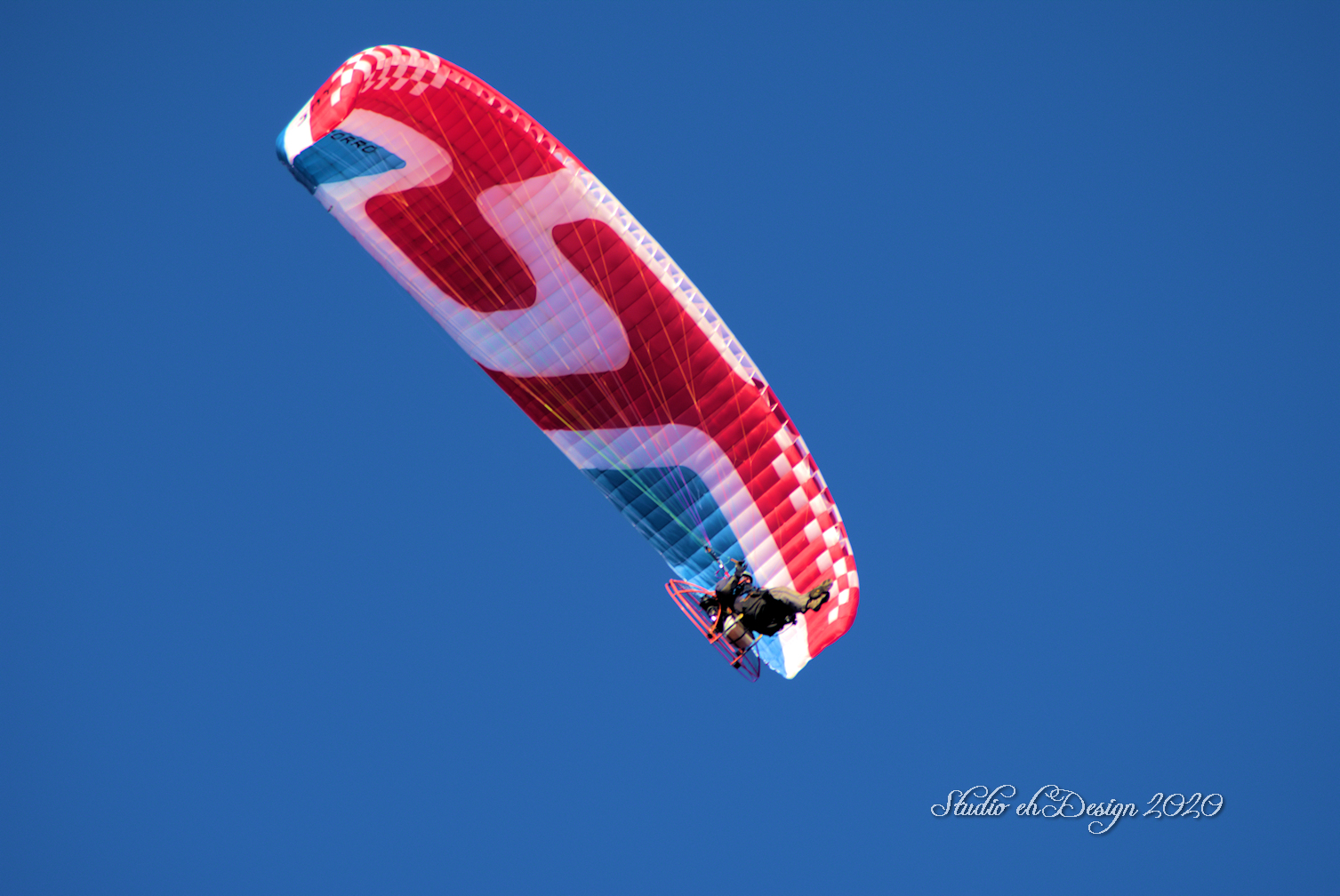 Meanwhile overhead a local paraglider with a big fan on his back flies by.